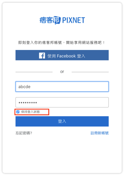當您在 PIXNET 任意頁面點選「登入」至登入頁後,請您勾選「保持登入狀態」,站方就會紀錄您的登入狀態保持 30 天,讓您在 30 天內使用同部電腦登入,都不需要重新輸入帳號密碼,保持在 PIXNET 的登入狀態。