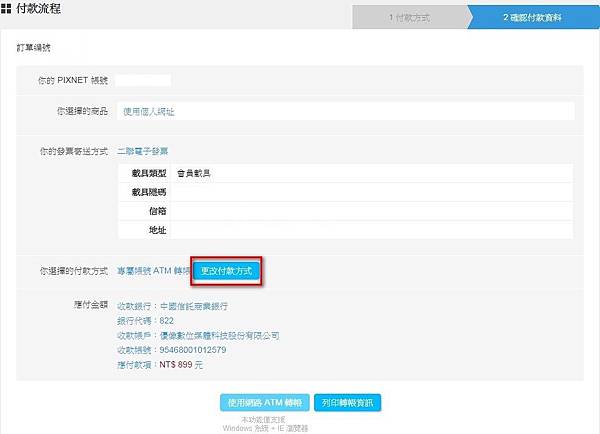 進入確認付款資料頁面,確認相關資訊,若希望變更其他付款方式,亦可按下「更改付款方式」重新選擇付款方式。