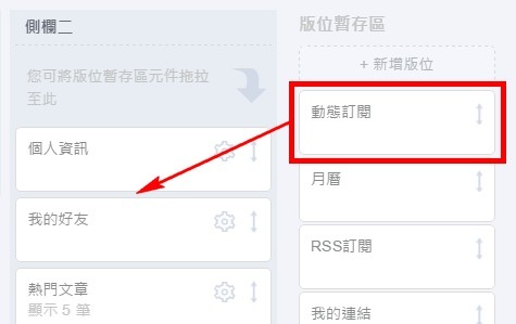 2. 若您未使用「動態訂閱」欄位,請先將其自「版位暫存區」拖曳至您的側欄一或二中。