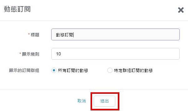 圖示按鈕,在視窗中依您的需求輸入欄位標題,並選擇想要顯示的動態筆數以及訂閱群組,設定完成後按下「送出」。