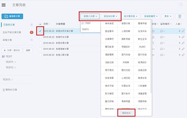 2. 請勾選您要更改分類的文章,點選「設個人分類」或「設全站分類」,下拉選擇您欲更改的分類項目類別即可。