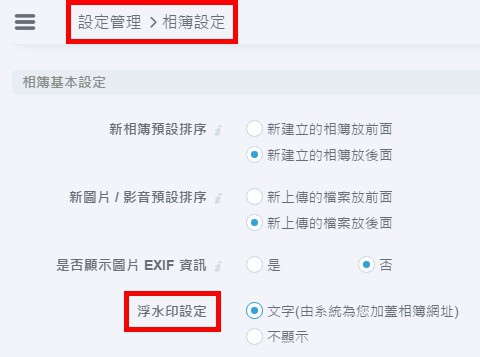 2. 請您找到相簿基本設定>「浮水印設定」,依您的需求選擇「文字(由系統為您加蓋相簿網址)」或「不顯示」後,按下頁面下方的「完成並儲存設定」即可。