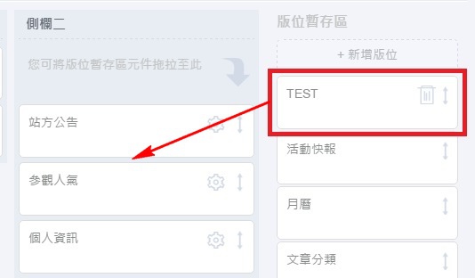 3. 請將您剛才新增的自訂欄位從「版位暫存區」拖曳至側欄一或二放置即可。